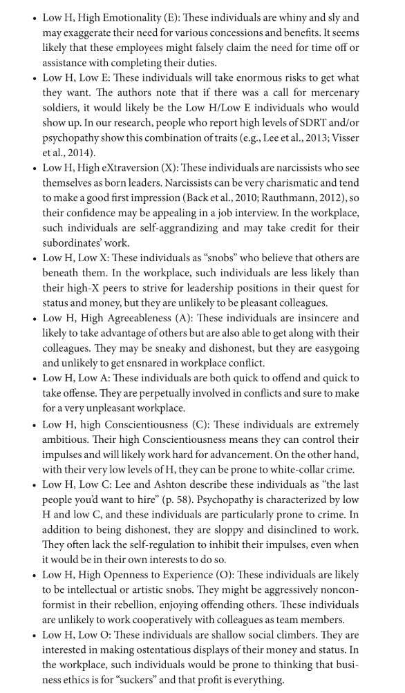 "Not all of the dark personality traits were most strongly charactized by low Honesty-Humility (Book et al., 2016). Narcissism, for example, was most strongly related to high eXtraversion, and everyday sadism was highly related to low Emotionality as well as low Honesty-Humility."